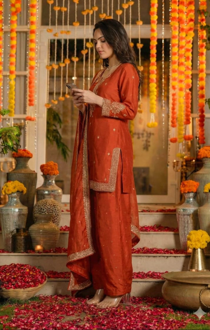 Rust Orange Silk Sharara Set