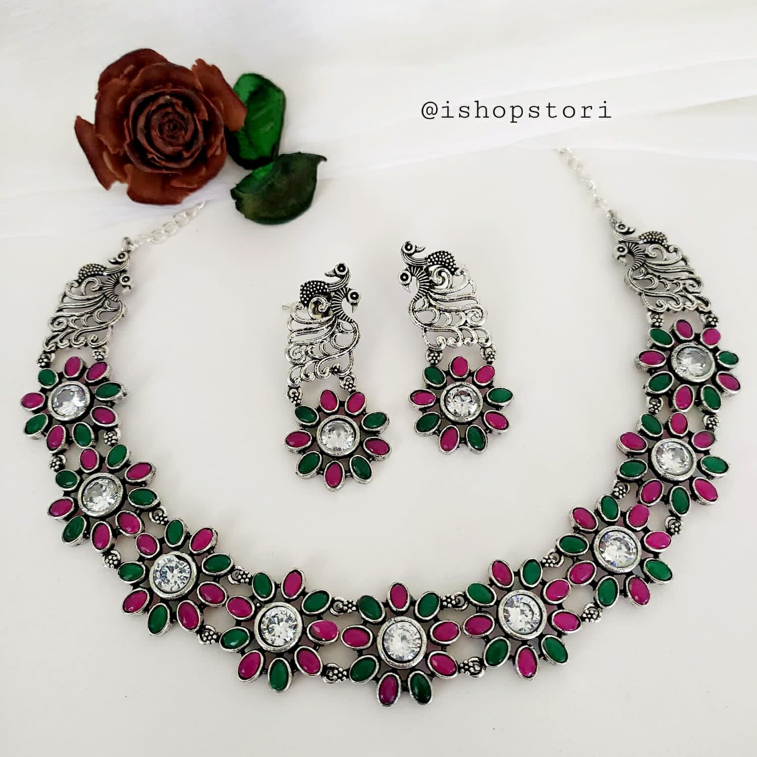 Taarika Oxidised Necklace Set with stones and earring studs.